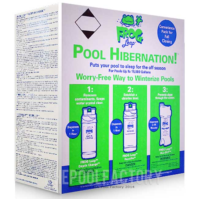 Easy 3-step winterizing program puts the pool to sleep for the off season. Treats up to 15,000 gallons. Uniquely dispenses through the FROG Leap System. Worry Free way to winterize pools.