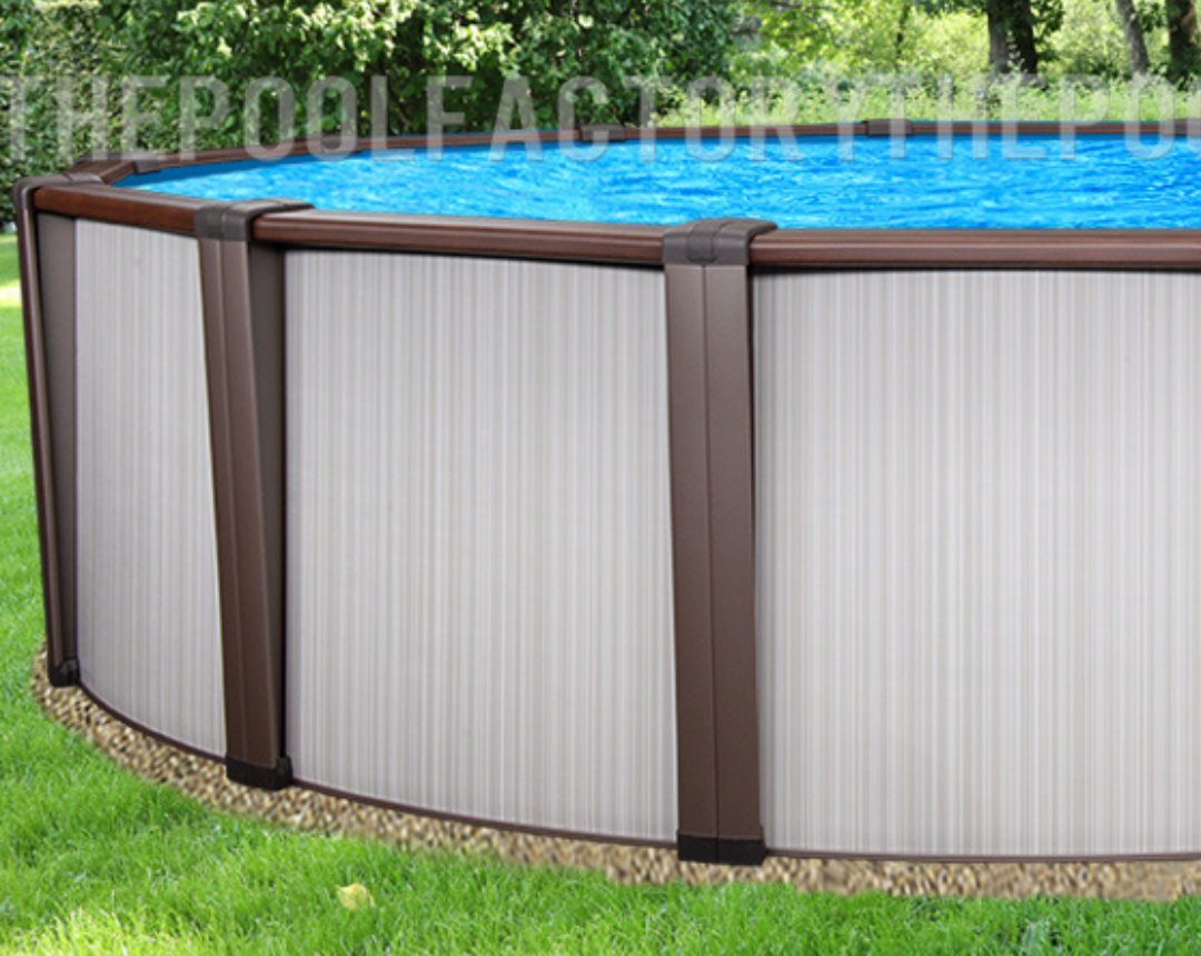 The Daytona introduces textures, colors, angles and even proportions with the introduction of wood patterns through new printing technology. This technology has never been seen before on above ground pools. The Daytona's structural parts are treated with a double coating of heat setting polyester that ensures a great look for a long time. The top seats are printed with a Walnut pattern and offers a Bronzed steel look with Metallic Highlights. It's reinforced steel core with anti-corrosion coating of Magnesium, Copper & Aluminum increases rust protection by 72%. Combined with the wall's graphic, Daytona achieves an unparalleled level of quality.