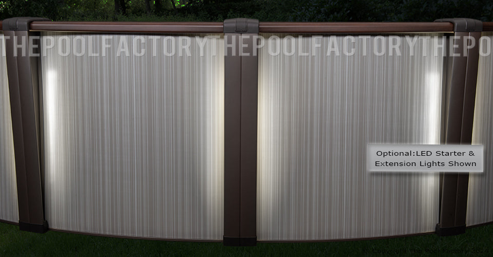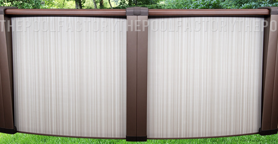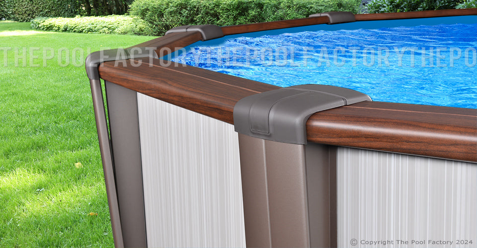 The Daytona introduces textures, colors, angles and even proportions with the introduction of wood patterns through new printing technology. This technology has never been seen before on above ground pools. The Daytona's structural parts are treated with a double coating of heat setting polyester that ensures a great look for a long time. The top seats are printed with a Walnut pattern and offers a Bronzed steel look with Metallic Highlights. It's reinforced steel core with anti-corrosion coating of Magnesium, Copper & Aluminum increases rust protection by 72%. Combined with the wall's graphic, the Daytona achieves an unparalleled level of quality.