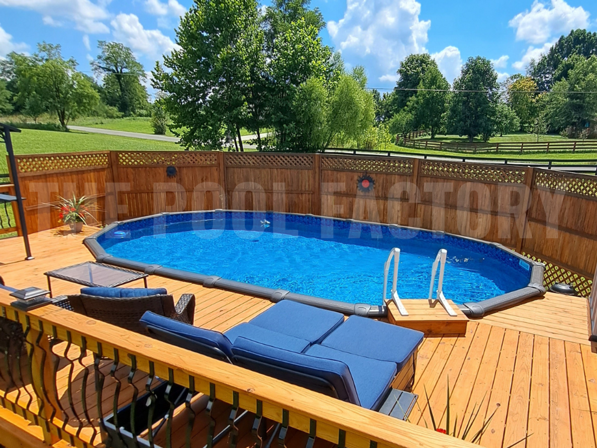 The Melenia oval features the Yardmore space saving support system that incorporates superior strength and an attractive overall appearance. This oval system is supported with heavy steel beams and straps that run underneath the pool, eliminating the need for poles or large braces protruding at each side of the pool. This sleek oval design allows more pool size while occupying less space, giving a clean and uncluttered presence.